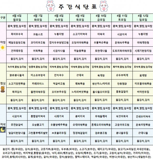 <식단표> 2026.04.06~ 2026.04.12 페이지 정보 작성자 강북연세요양병원 작성일 26-04-03 15:44 조회 114회 댓글 0건 관련링크 본문 상기 식단은 식재료 수급사정으로 변경 될 수도 있습니다 댓글목록 등록된 댓글이 없습니다. 목록