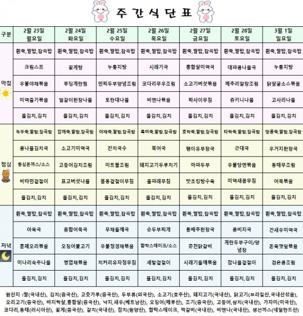 <식단표> 2026.02.23~ 2026.03.01 페이지 정보 작성자 강북연세요양병원 작성일 26-02-21 09:36 조회 6회 댓글 0건 관련링크 본문 상기 식단은 식재료 수급 사정으로 변경 될 수도 있습니다 댓글목록 등록된 댓글이 없습니다. 목록