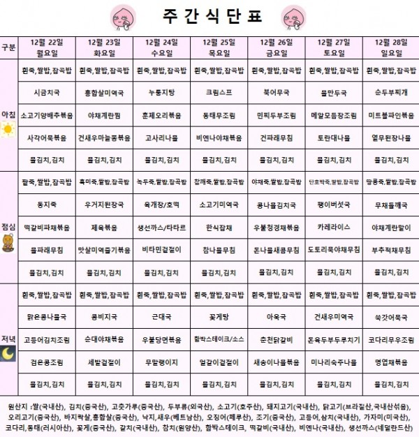 <식단표> 2025.12.22~ 2025.12.28 페이지 정보 작성자 강북연세요양병원 작성일 25-12-19 14:09 조회 7회 댓글 0건 관련링크 본문 *상기 식단은 식재료 수급 사정으로 변경 될 수도 있습니다 댓글목록 등록된 댓글이 없습니다. 목록