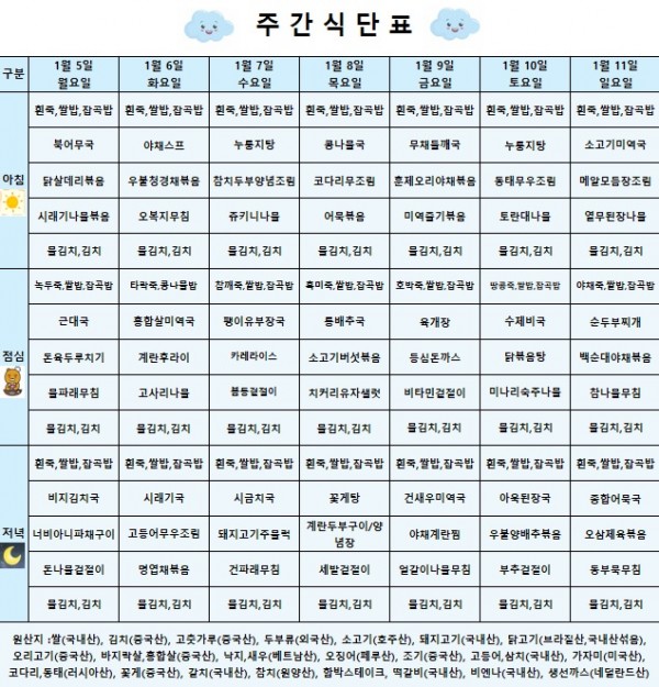 <식단표> 2026.01.05~ 2026.01.11 페이지 정보 작성자 강북연세요양병원 작성일 26-01-02 13:51 조회 121회 댓글 0건 관련링크 본문 상기 식단은 식재료 수급 사정으로 변경 될 수도 있습니다 댓글목록 등록된 댓글이 없습니다. 목록