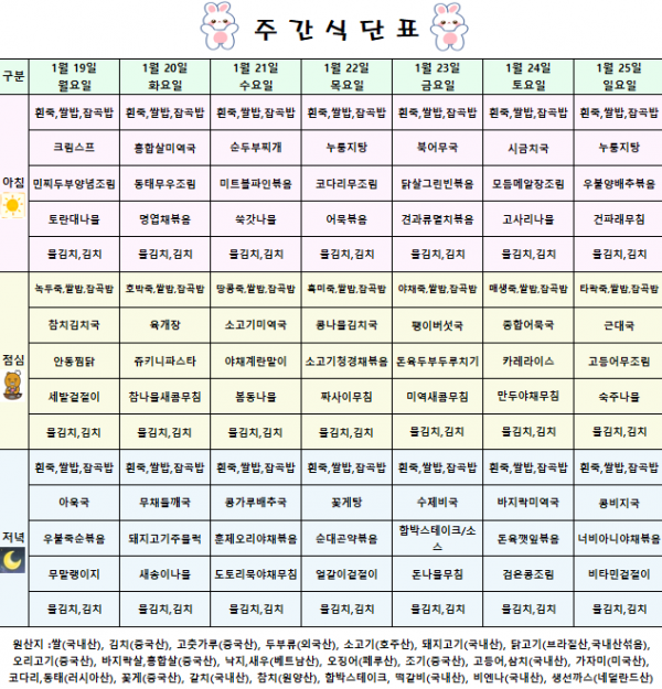 <식단표> 2026.01.19~ 2026.01.25 페이지 정보 작성자 강북연세요양병원 작성일 26-01-17 10:11 조회 71회 댓글 0건 관련링크 본문 상기 식단은 식재료 수급 사정으로 변경 될 수도 있습니다 댓글목록 등록된 댓글이 없습니다. 목록