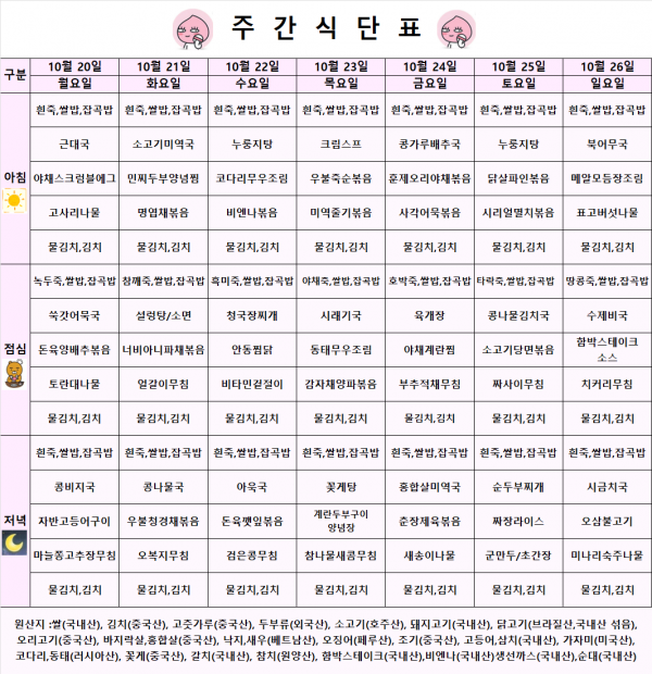 <식단표> 2025.10.20~ 2025.10.26 페이지 정보 작성자 강북연세요양병원 작성일 25-10-17 09:13 조회 114회 댓글 0건 관련링크 본문 * 상기 식단은 식재료 수급사정으로 변경 될 수도 있습니다. 댓글목록 등록된 댓글이 없습니다. 목록