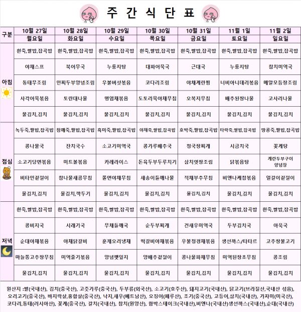 <식단표> 2025.10.27~ 2025.11.02 페이지 정보 작성자 강북연세요양병원 작성일 25-10-24 14:05 조회 45회 댓글 0건 관련링크 본문 * 상기 식단은 식재료 수급 사정으로 변경 될수도 있습니다. 댓글목록 등록된 댓글이 없습니다. 목록