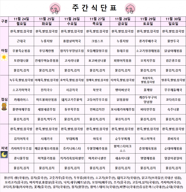 <식단표> 2025.11.24~ 2025.11.30 페이지 정보 작성자 강북연세요양병원 작성일 25-11-21 09:44 조회 157회 댓글 0건 관련링크 본문 * 상기 식단은 식재료 수급 사정으로 변경 될 수도 있습니다. 댓글목록 등록된 댓글이 없습니다. 목록