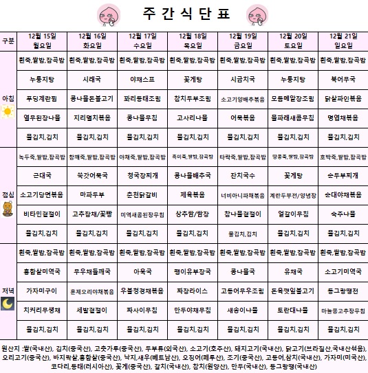 <식단표> 2025.12.15~ 2025.12.21 페이지 정보 작성자 강북연세요양병원 작성일 25-12-12 14:11 조회 73회 댓글 0건 관련링크 본문 *상기 식단은 식재료 수급 사정으로 변경 될 수도 있습니다 댓글목록 등록된 댓글이 없습니다. 목록
