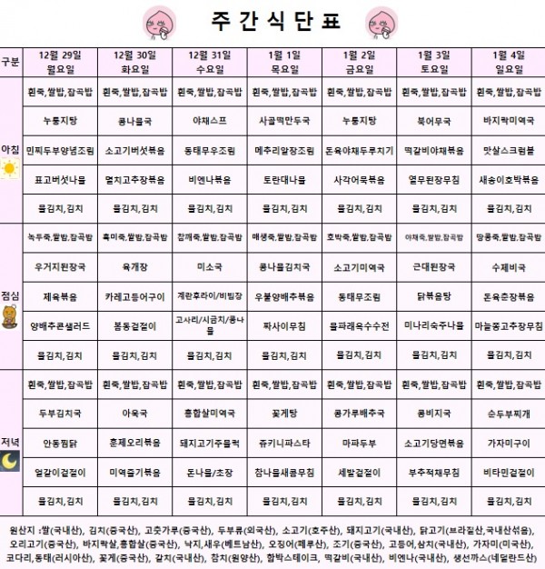 <식단표> 2025.12.29~ 2026.01.04 페이지 정보 작성자 강북연세요양병원 작성일 25-12-26 16:28 조회 21회 댓글 0건 관련링크 본문 *상기 식단은 식재료 수급 사정으로 변경 될 수도 있습니다 댓글목록 등록된 댓글이 없습니다. 목록