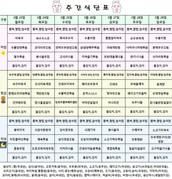 <식단표> 2026.03.23~ 2026.03.29 페이지 정보 작성자 강북연세요양병원 작성일 26-03-20 10:13 조회 108회 댓글 0건 관련링크 본문 상기 식단은 식재료 수급 사정으로 변경 될 수도 있습니다 댓글목록 등록된 댓글이 없습니다. 목록