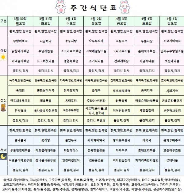 <식단표> 2026.03.30~ 2026.04.05 페이지 정보 작성자 강북연세요양병원 작성일 26-03-27 14:07 조회 13회 댓글 0건 관련링크 본문 상기 식단은 식재료 수급 사정으로 변경 될 수도 있습니다 댓글목록 등록된 댓글이 없습니다. 목록