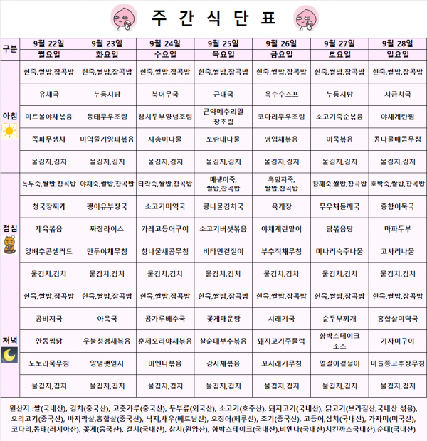 <식단표> 2025.09.22~ 2025.09.28 페이지 정보 작성자 강북연세요양병원 작성일 25-09-19 14:38 조회 182회 댓글 0건 관련링크 본문 * 상기 식단은 식재료 수급 사정으로 변경 될 수도 있습니다. 댓글목록 등록된 댓글이 없습니다. 목록