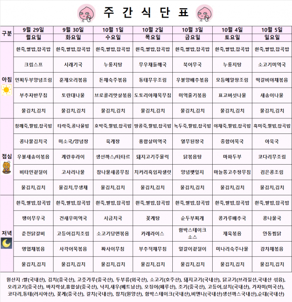 <식단표> 2025.09.29~ 2025.10.05 페이지 정보 작성자 강북연세요양병원 작성일 25-09-26 16:14 조회 156회 댓글 0건 관련링크 본문 * 상기 식단은 식재료 수급사정으로 변경 될 수도 있습니다. 댓글목록 등록된 댓글이 없습니다. 목록